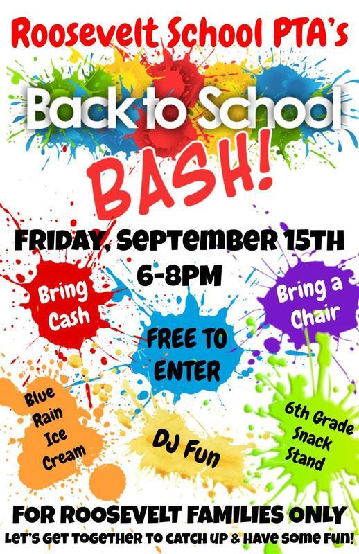 Let's start the school year off with a bang! Roosevelt PTA's Back to School Bash is on Friday, September 15th from 6-8PM. Don't forget to bring cash to purchase ice cream or snacks!